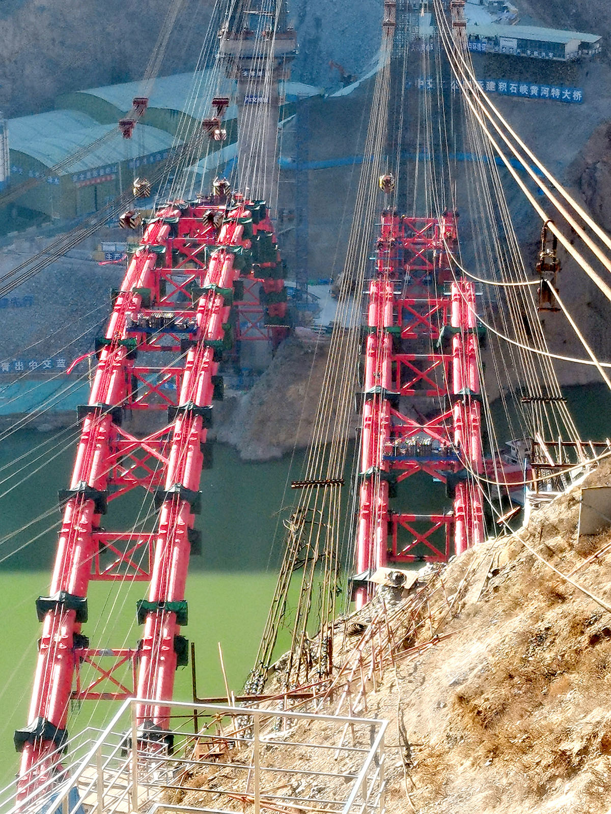 該橋?yàn)橹骺?65米的上承式鋼管混凝土拱橋,全長(zhǎng)492.72米的大橋,采用4×60t纜索起重機(jī)進(jìn)行安裝,2025年1月15日合龍。